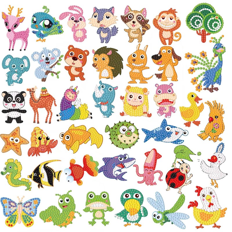 - DIY diamond painting kit: diamond painting kit package contains 40 types of cute animal character stickers, corresponding diamonds and necessary tools, such as diamond pens, trays and wax, so easy and fun for children and children.