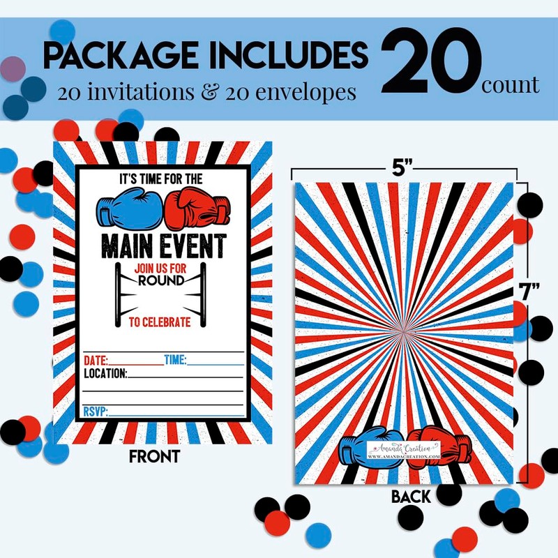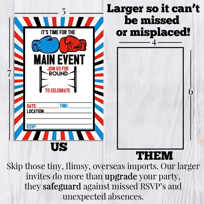 - Awesome Quality: Forget smaller, chintzier cards printed on flimsy paper. At 5"x7" Boxing Birthday Invites are bigger & sturdier than most. Plus, they're printed on 80# stock for ultra durability.