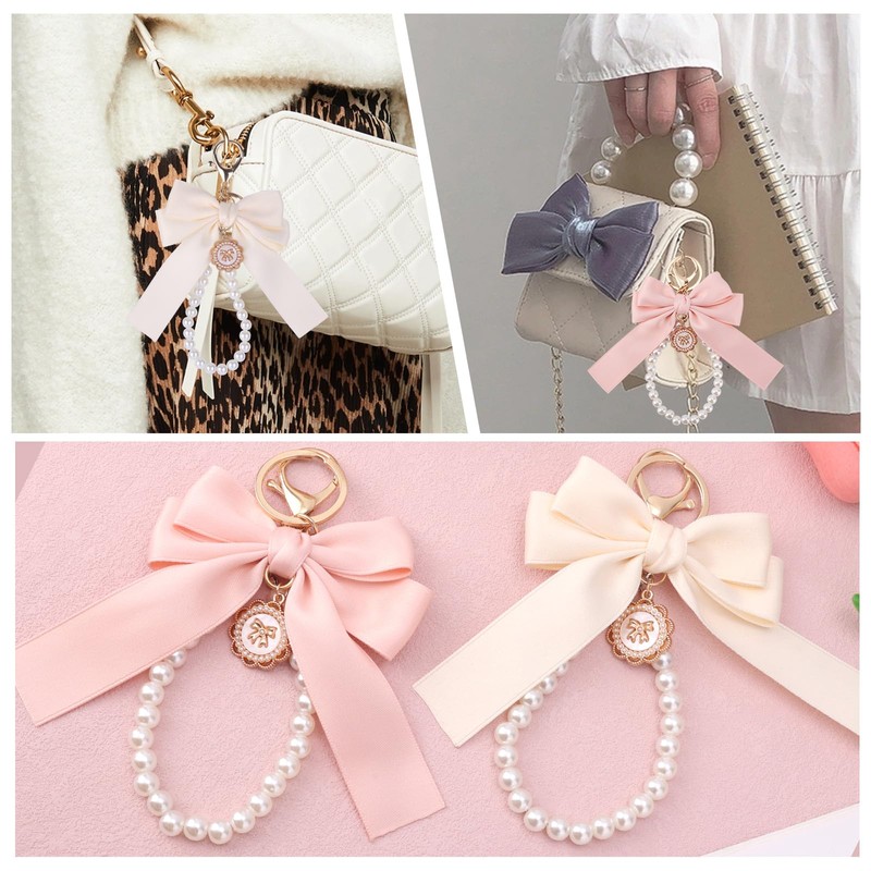 BOXOB 2pcs Bow Keychain, Ribbon & Pearl Bag Charm Cute Key Chain Bow Purse Charm Coquette Wristlet Keychain Handbags Accessories for Women (Pink & White)