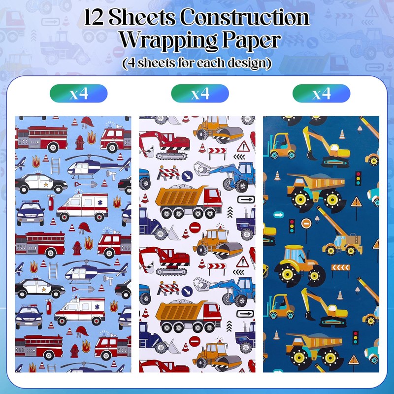 Boy Birthday Wrapping Paper - 12 Sheets Construction-Themed Gift Wrap - Fire Truck Ambulance & Construction Vehicles Designs - Perfect for Kid’s Parties, Birthday, Celebrate & Crafts, 19.7"x27.6"