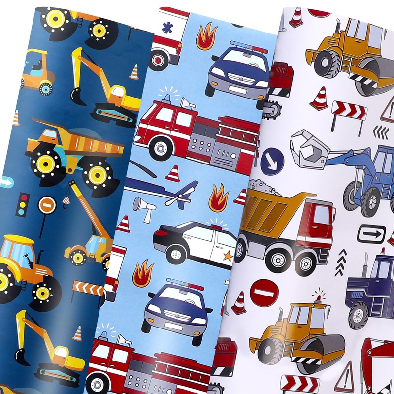 - DISTINCTIVE CONSTRUCTION-THEMES: Our wrapping paper features vibrant prints of trucks, ambulances fire truck, helicopter and construction vehicles, perfect for injecting excitement into any boy's birthday celebration