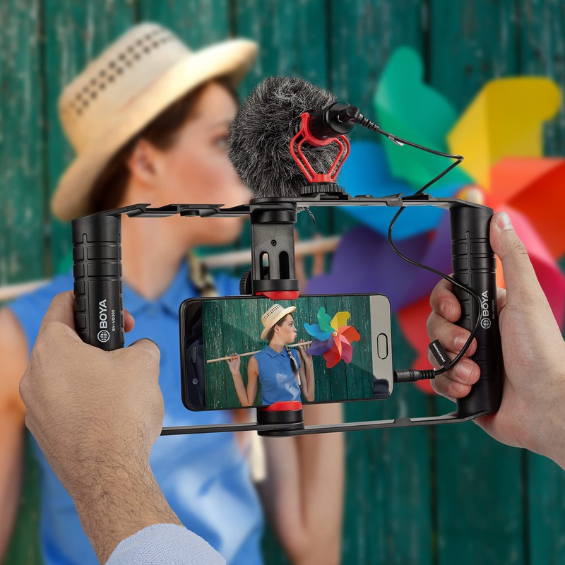 BOYA Walimex pro Smartphone Video Kit VG380 I Video Stabilisator I Video Rig mit Mikrofon und Halterung, Dreibein Stativ, universellem Smartphone-Halter und Fell-Windschutz I mobiles Vlogging Kit
