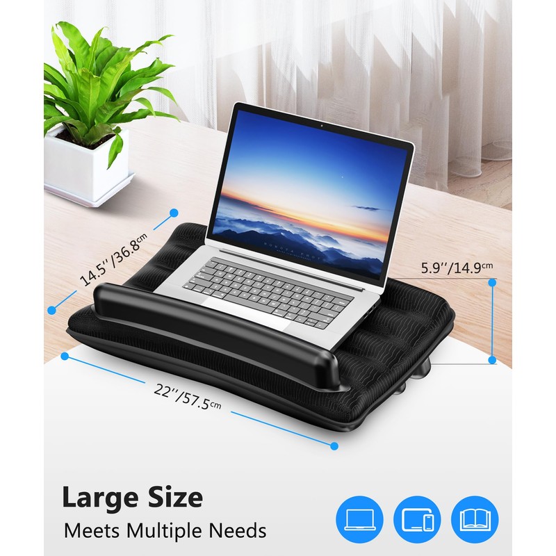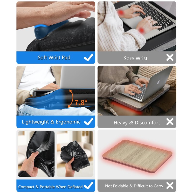 - 【Spacious Usable Area】Inflated dimensions are 20 inches by 14 inches, supporting laptops up to 17 inches (without a mouse). The laptop lap desk also accommodates tablets, phones, books, and magazines, adapting to various needs.