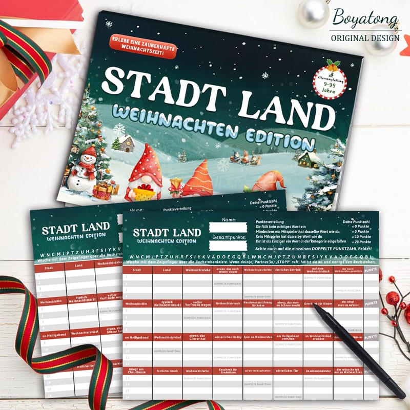 - 【Spiel für die Ganze Familie】Erleben Sie die Stadt Land Fluss Weihnachten Edition – ein lustiges Spiel für die ganze Familie und Freunde. Perfekt für Weihnachtsfeiern, Familiengeschenke Weihnachten oder als Adventskalender Füllung. Spaß und Spannung für Kinder, Erwachsene und alle, die Weihnachtsspiele lieben