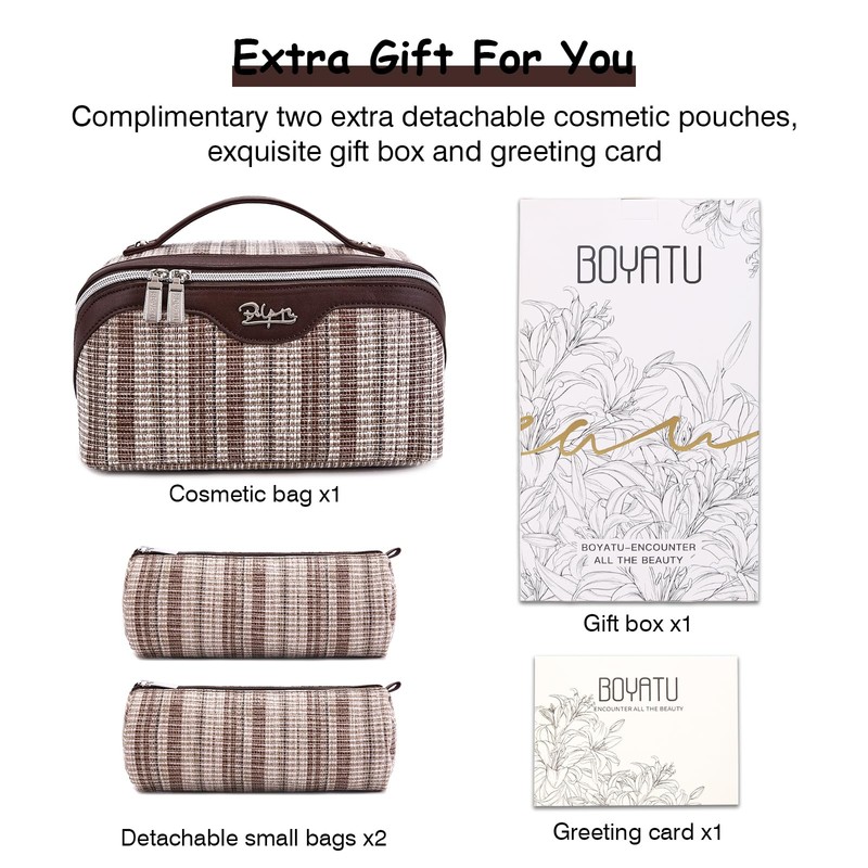 - 3-Piece Travel Makeup Bag Set: BOYATU makeup bag for women includes two removable zippered small bags and five smart compartments to neatly store all your skincare and makeup essentials.Ideal for travel,business trips,vacations,camping,or picnics.This versatile set keeps everything organized on the go.