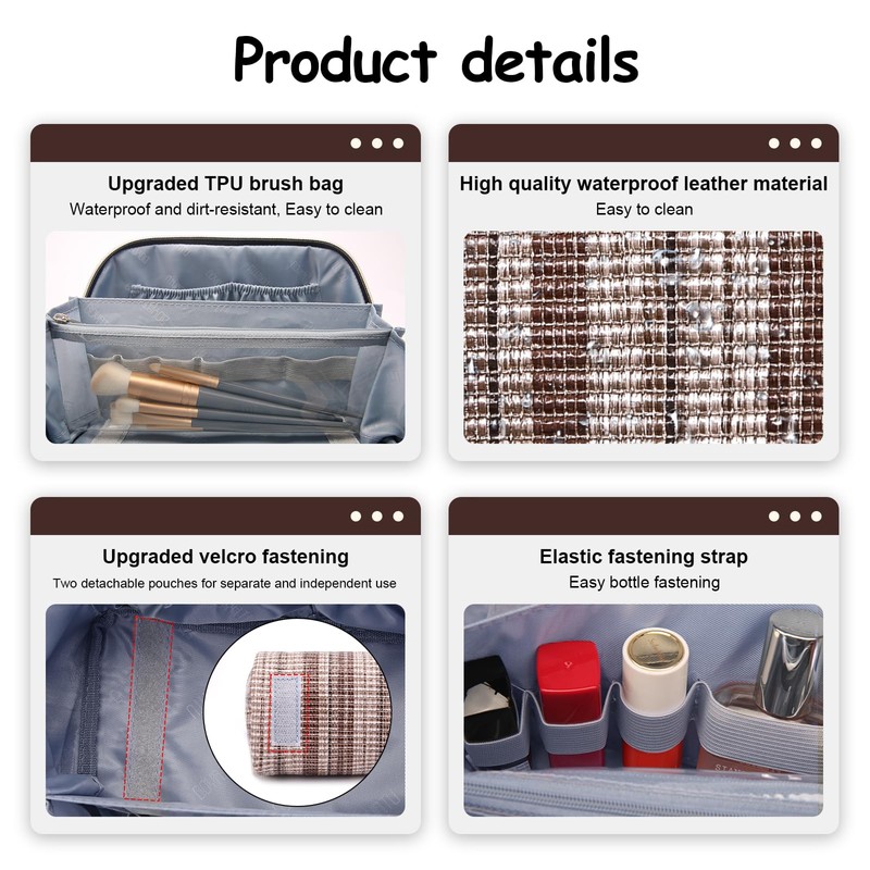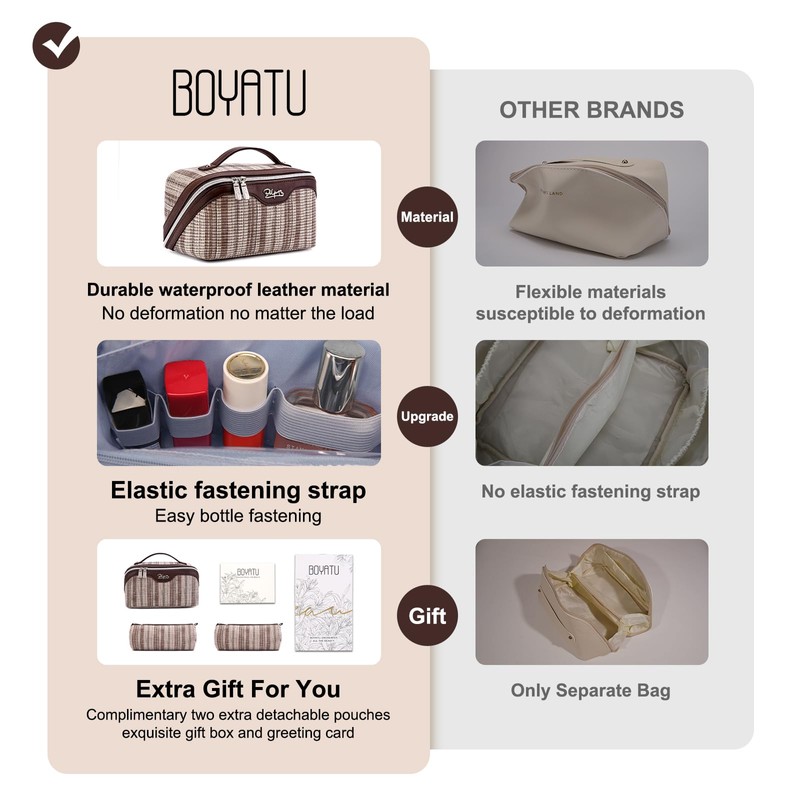 - Leak-Proof Travel Makeup Bag: An excellent leather waterproof makeup travel bag,it has upgraded a spill-resistant interior liner that prevents leaks and traps odors.BOYATU portable make up bag is a great choice and ideal companion for traveling or using every day.