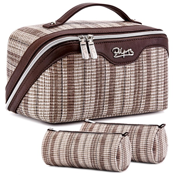 BOYATU Travel Makeup Bag for Women: Large Capacity Open Flat Make up Bag Set of 3 - Vegan Leather Cosmetic Bag with Compartments - Waterproof Toiletry Bag with Handle & Divider(Brown)