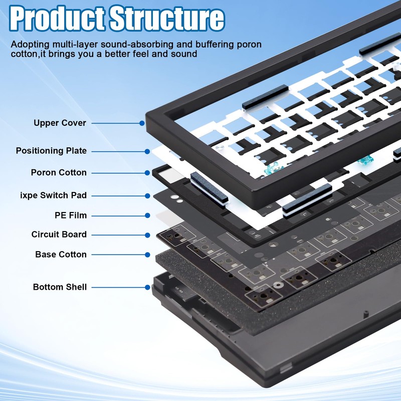 • ✅【Gasket-mounted Barebones Keyboard】This 65% Layout Customized mechanical keyboard uses a gasket material on the keyboard plate's top that reduces the occurrence of vibrations within your keyboard case,complemented by PORON gaskets, significantly minimizes cavity sound, enhancing your typing sounds. Offering a very satisfying typing experience!