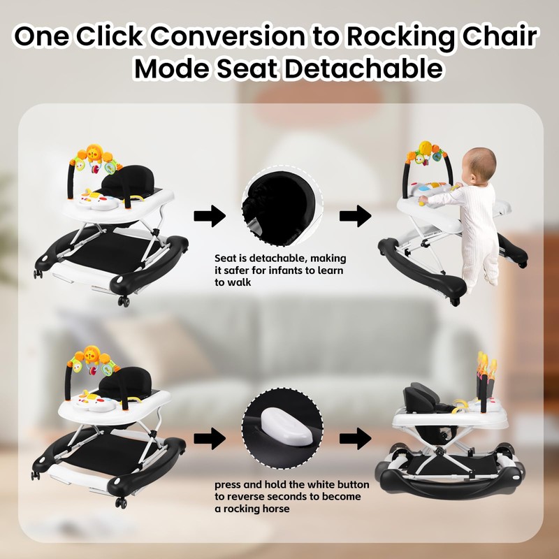 - 【5-IN-1 Baby Walker Design】: The walker for babies has 5 modes: Walk, Bouncer, Rocking, Push, Eating. Mom can choice mode according to your baby needs. The walker baby meets the needs of baby at every stage from 6 months to 18 months