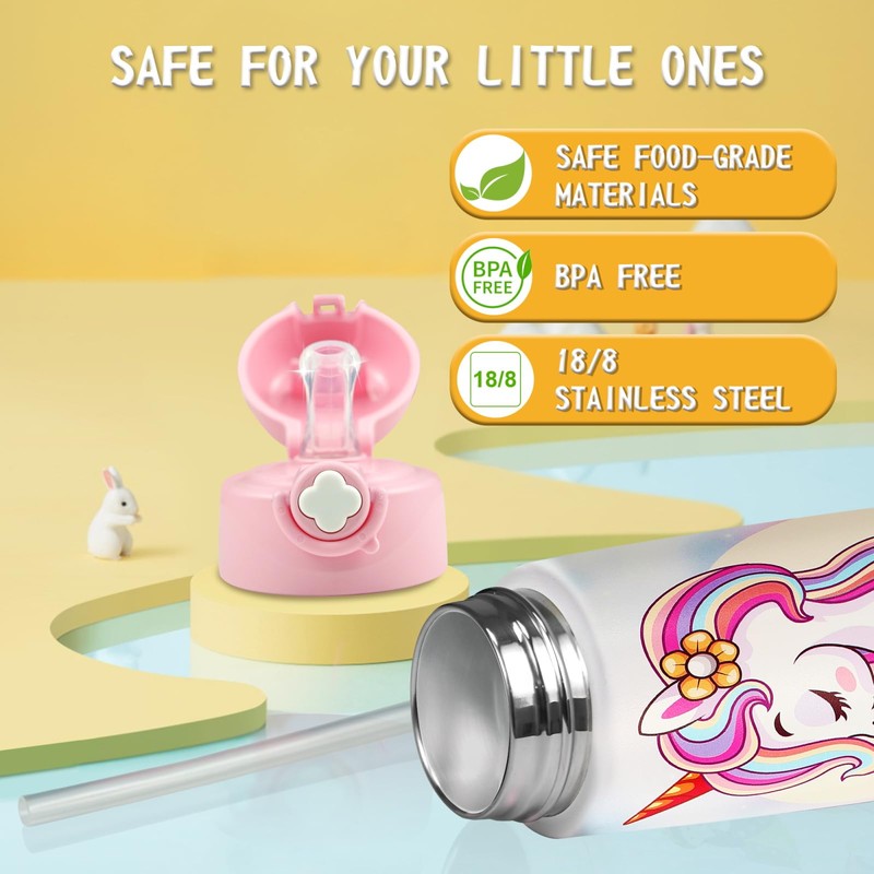 - SAFE FOOD-GRADE MATERIALS:The cup body is made of 18/8 stainless steel,The straw of the kids water bottle is made of food-grade silicone,which is soft and does not hurt the baby's mouth. The straw lid is tightly sealed, effectively preventing water leakage and dust entry, and providing a safe drinking environment for your little one
