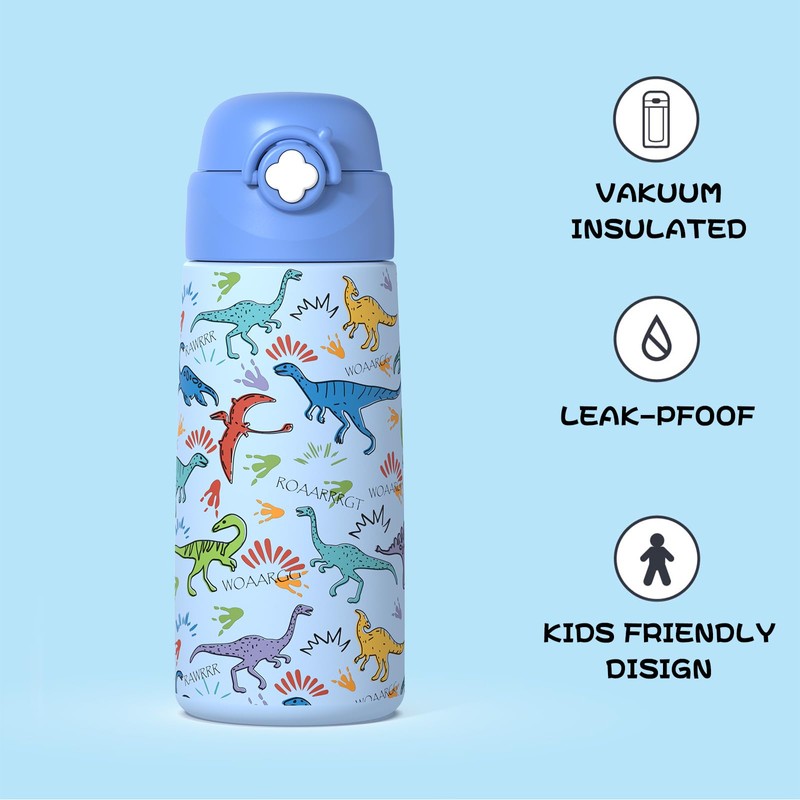 - STAY COLD+LEAK PROOF:This kids'water bottle designed with double-wall vacuum insulation.It keeps liquids cold for up to 12 hours.The exterior of the bottle remains sweat-free.The bottle also features a leak-proof lockable lid for added convenience