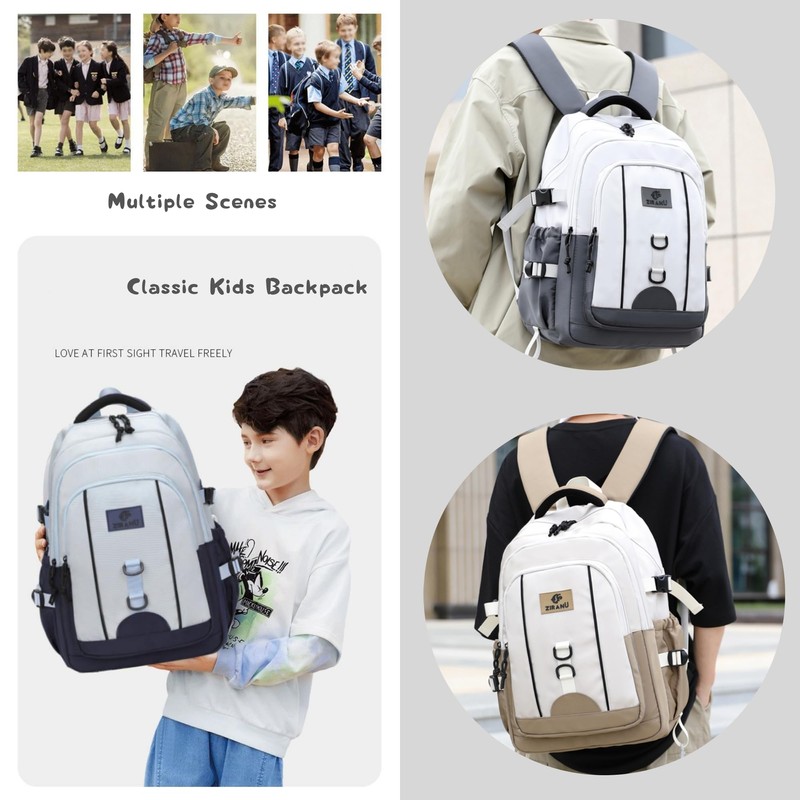 Boys School Bag Backpack for Kids, Rucksack for Primary Secondary School Boys, White+Grey