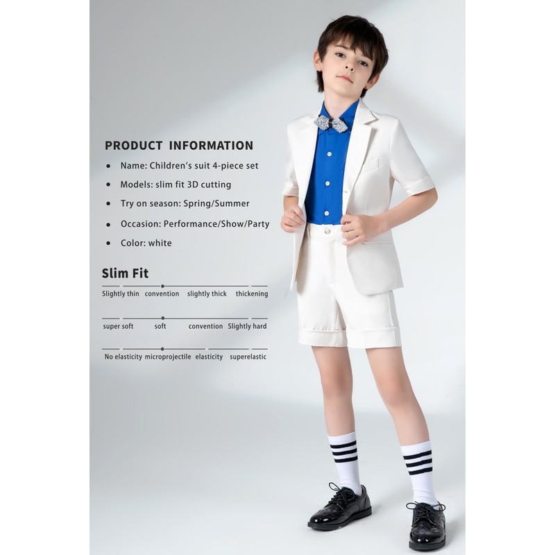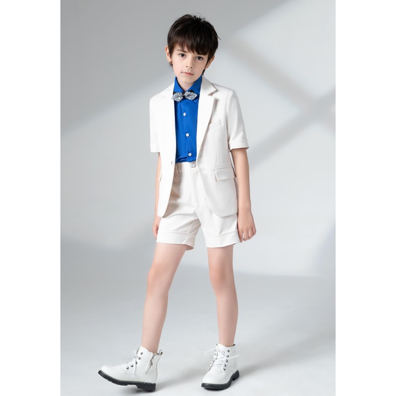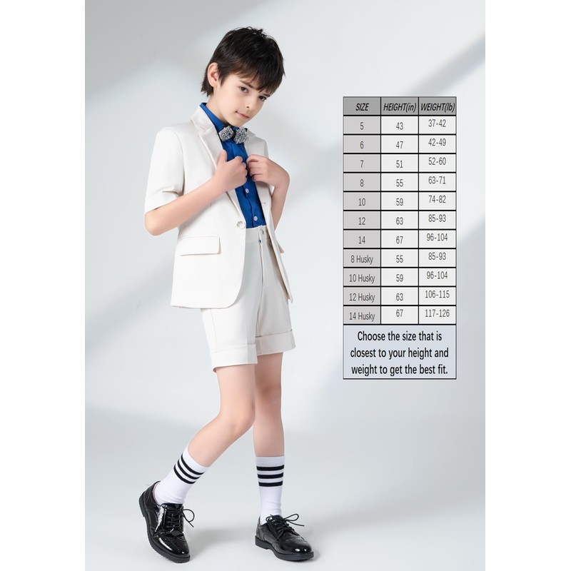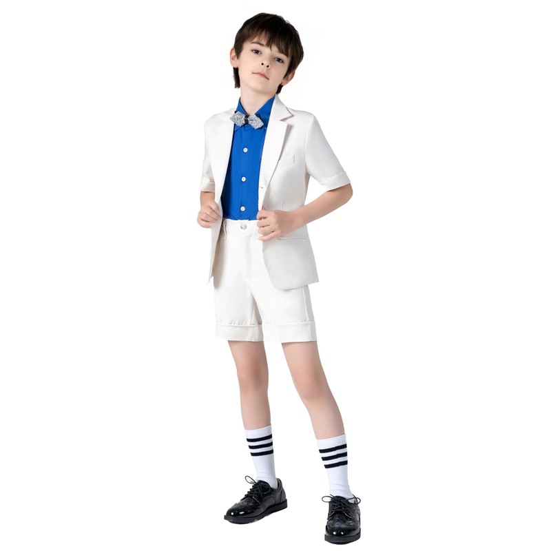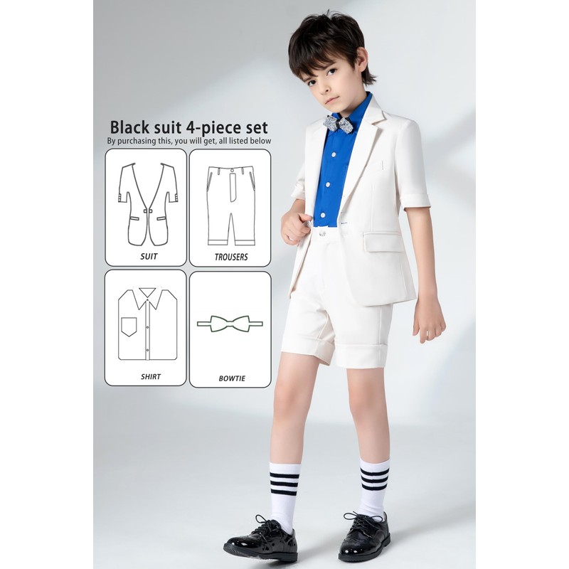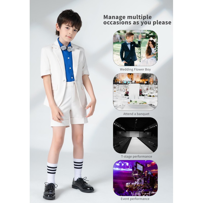 Boys Suit Kids Tuxedo Wedding Ring Holder Costume Boys Formal 4 Piece Set Slim Stripe Formal Short Sleeve Shorts Cool (US, Numeric, 5, Regular, White)