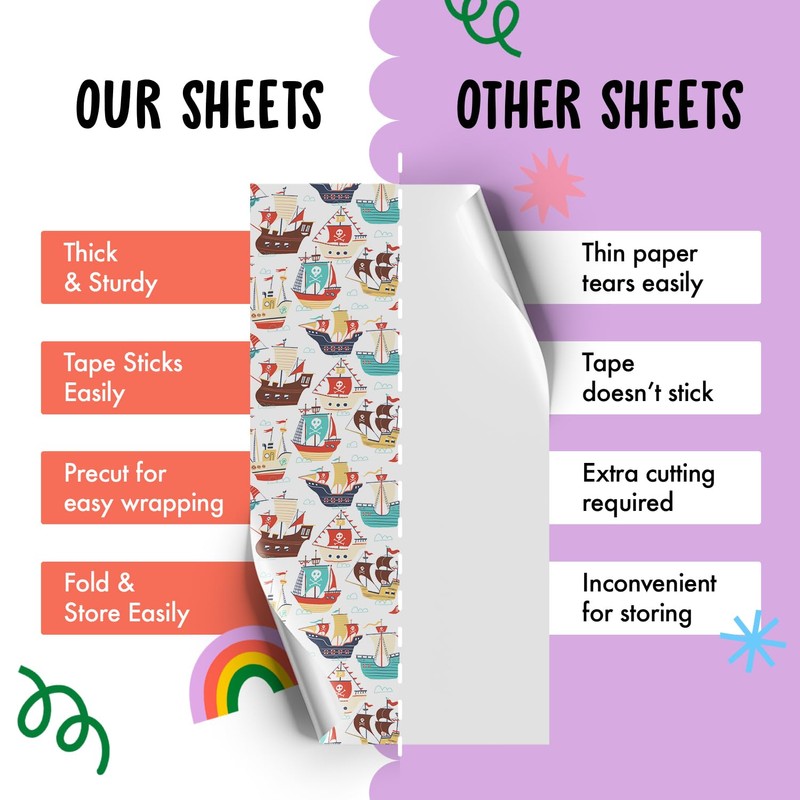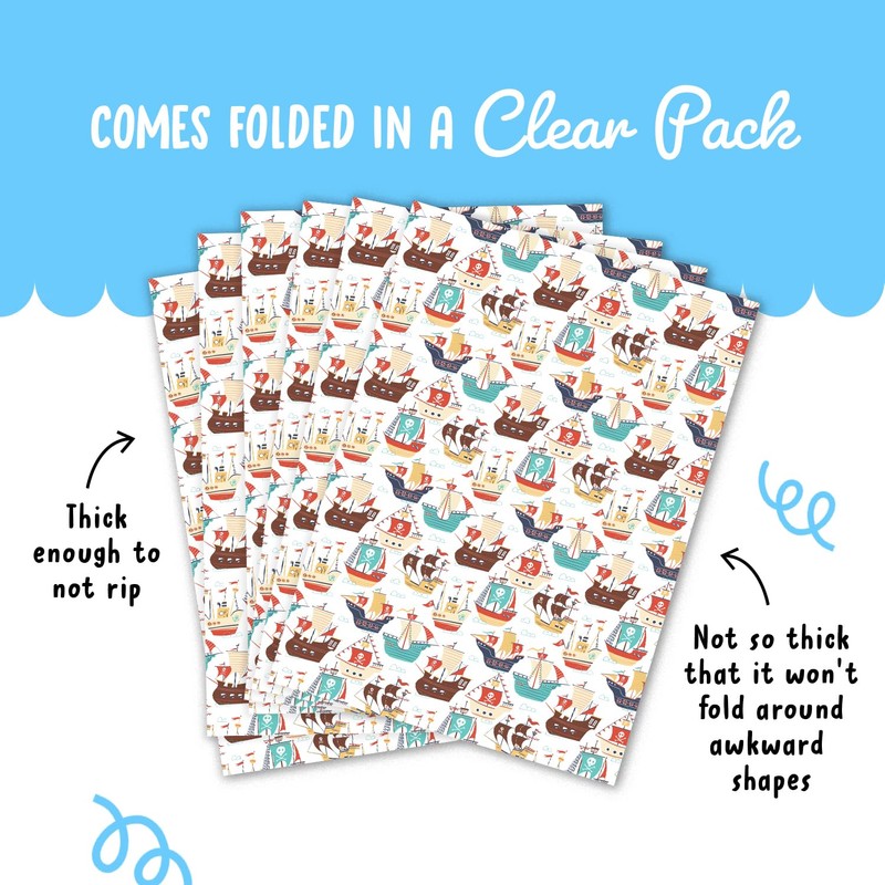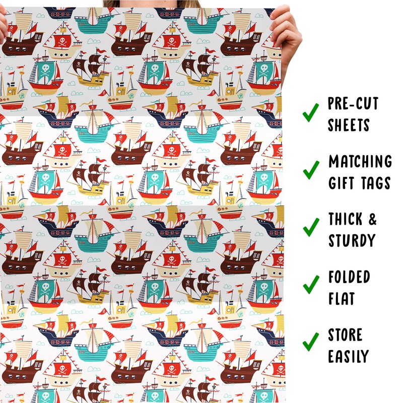 Boys Wrapping Paper - 6 Sheets Of Eco-friendly Gift Wrap For Kids - Pirate Ships - White Wrapping Paper - Comes With Stickers - Recyclable - By Central 23