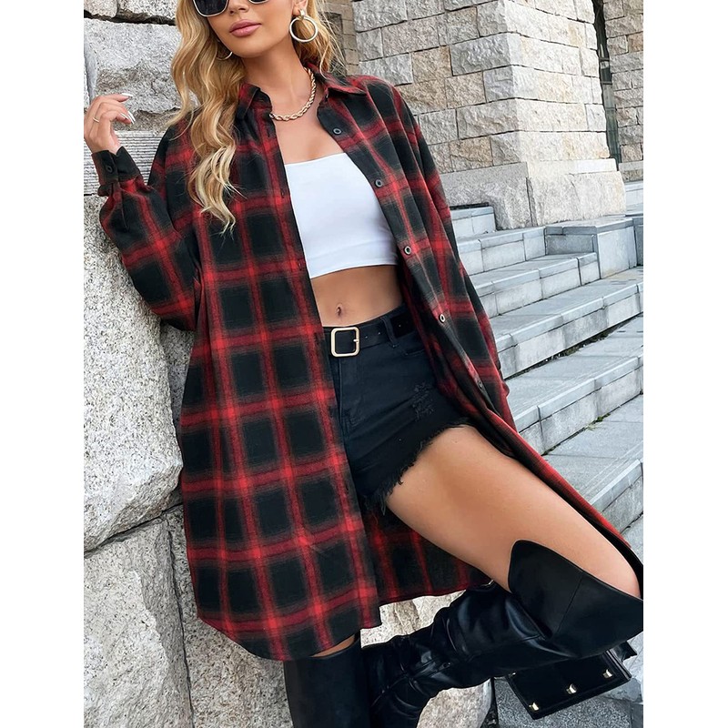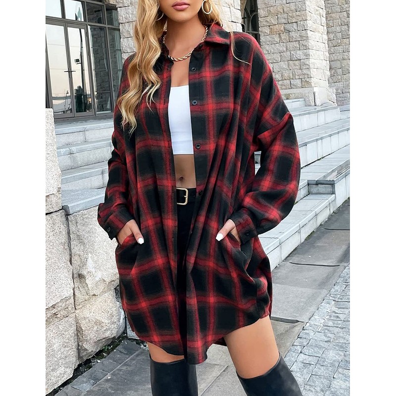 Bozanly Women's Oversized Button Down Long Plaid Flannel Shirts Lapel Long Sleeve Check Jacket Shacket(0501-Red-L)