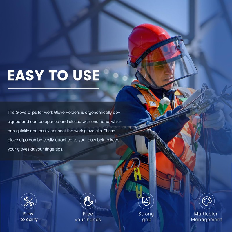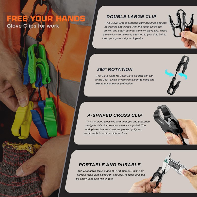 Glove Clips For Work Glove Holders:Keep your work gloves organized and within reach with these glove clips. This 6-pack of glove holders comes in a Eye-catching color assortment of colors,making it easy to distinguish your gloves from others. Simply clip them onto your belt, pocket, or bag, and your gloves will always be securely attached and ready for use. Crafted from durable materials, these glove clips are built to withstand the demands of tough work environments. Whether you're a construction worker, mechanic, gardener, or outdoor enthusiast, these glove holders are an essential accessory for keeping your gloves close at hand. With their compact size (approximately 3 inches long) and lightweight design, you'll hardly notice them until you need them. Stay organized, efficient, and prepared with this convenient 6-pack of glove clips.