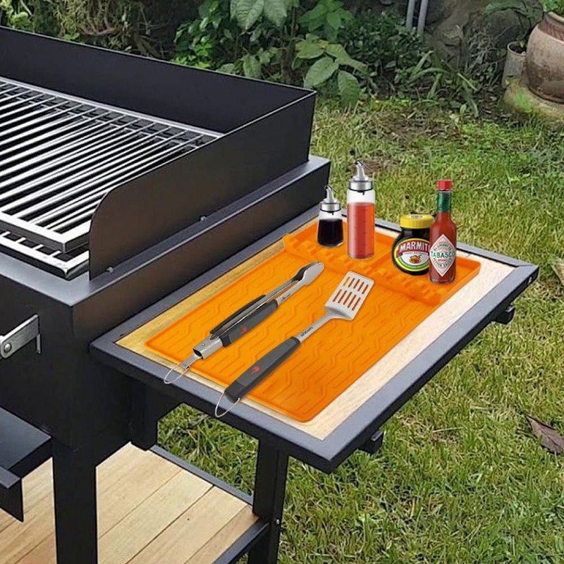 BPA-Free Silicone Cooking Mat: Ultimate Tool Organizer with Drip Pan for Griddles, Grills, and Countertops (2Pcs, Orange and Gray)