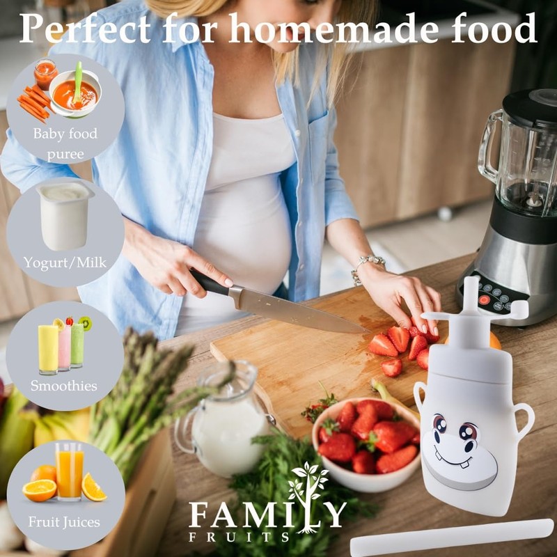 FAMILY FRUITS Reusable Food Pouches for Baby: Make mealtime a breeze for both parents and little ones with our earth-friendly reusable baby pouches. Crafted from high-quality food-grade silicone, this silicone pouch is a safe and greener alternative to single-use plastic disposable baby food pouches. Our silicone pouches baby food feature a wide-mouth design, making them easy to fill, empty, and clean. Say goodbye to hard-to-reach nooks and crannies! Each reusable squeeze pouch pack comes with an extra-wide straw and a cleaning brush, ensuring thorough and convenient cleaning after each use. These reusable yogurt pouches for kids are perfect for making fruit snacks, baby food, smoothies, homemade purees, and applesauces for babies and toddlers. The baby food pouch maker is also great for storing and serving yogurts, applesauce, and other soft foods. These yogurt pouches reusable are a cheaper alternative and also reduce waste, helping to protect our planet for future generations. Available in adorable designs like Harley the Hippo and Ellie the Elephant, these squeeze pouches refillable are sure to delight your little one. The fun characters add a touch of whimsy to mealtime, making it more enjoyable for everyone. With convenient handles, the apple sauce pouches reusable are easy for kids to self feed. The spill and leak proof design of these smoothie pouches reusable makes it travel friendly and easier for busy parents. Compact and space-efficient, the reusable puree pouches for babies effortlessly slip into lunchboxes and diaper bags, ensuring your little one's favorite treats are always within reach, wherever you go. About Us: FAMILY FRUITS is a small, family-owned business. We love designing convenient and thoughtful products that you can use in your daily life. These reusable baby food pouches silicone are an effort to do just that. We hope you love our reusable pouch pack as much as we do. Thanks for supporting our family business!