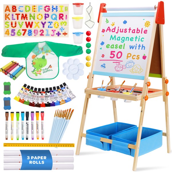 Bpmfkid 3 in 1 Adjustable Kids Art Drawing Easel Set-Sided Magnetic Whiteboard & Chalkboard with Painting Paper Roll - Versatile Art Station Gift for Toddlers, Kids and Childrens Ages 3+