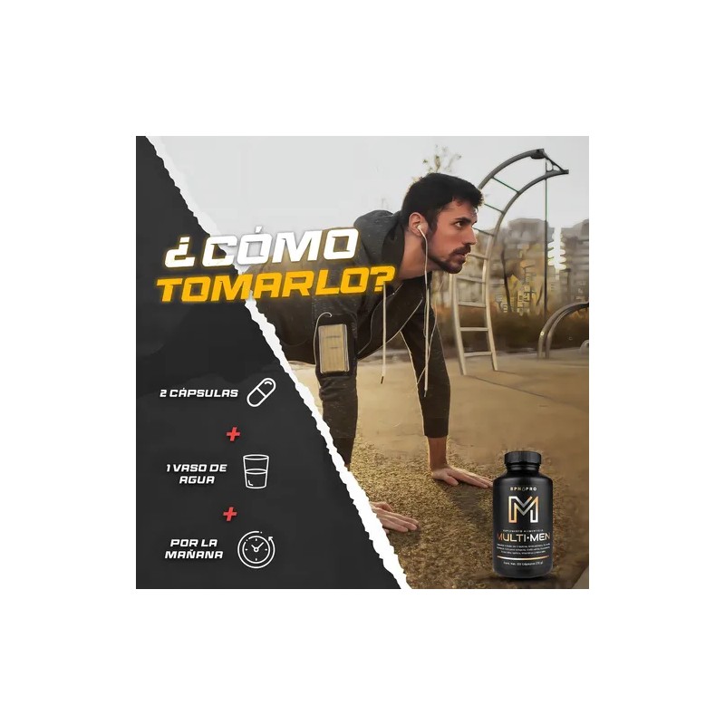 Multi Men de BPN PRO incluye ingredientes 100% naturales que benefician la salud diariamente. Contiene creatina, aminoácidos, té verde, espinaca, cúrcuma, café verde, vinagre de sidra de manzana, glutamina, vitaminas y minerales. Con un total de 120 cápsulas, este suplemento está avalado por Cofepris. Proporciona energía y mejora la salud gracias a su contenido de vitaminas C, B5, B3, E, B1, B2, B6, A, B9, K1, D3, B8, B12, magnesio, potasio, calcio, zinc, creatina monohidratada, arginina y una mezcla de aminoácidos esenciales, además de té verde, espinaca, cúrcuma y pulpa de uva. Dosis recomendada: 2 cápsulas durante el día con una comida. No contiene colorantes artificiales ni azúcares añadidos.