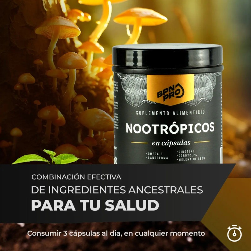BPN PRO Nootrópicos combina Melena de León, Omega 3, Ganoderma y Cordyceps para ofrecer un apoyo integral a la función cognitiva y el rendimiento mental. Esta fórmula vegana y libre de gluten está pensada para quienes buscan claridad mental, productividad y bienestar general.