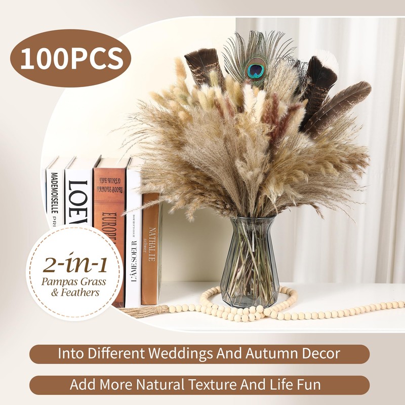 Bpole 2-in-1 Pampas Grass Decor - 100pcs Dried Pampas Grass with Natural Feathers Boho Flowers Arrangement for Vase,Home Wedding Party Centerpiece and Rustic Farmhouse Decor