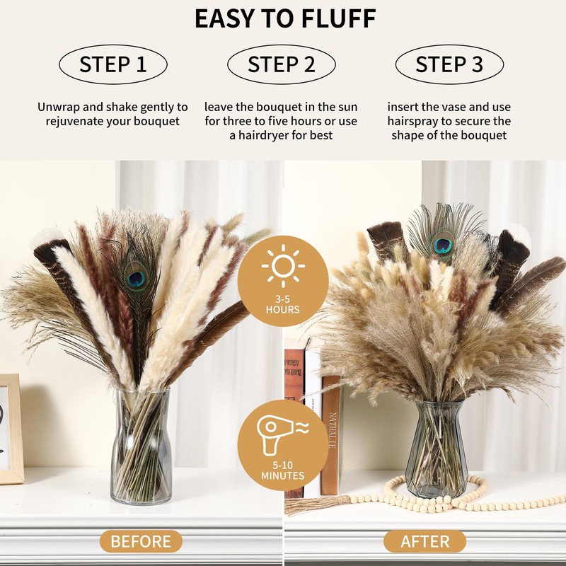 - Easy Maintenance:Please shake the stem in outdoors to reduce initial shedding.keep in the sunlight for 3-5hours to achieve maximum fluffiness.spray hair gel every 3 months and keep the dried flowers away from fire and moisture, they can be stored for a longer time