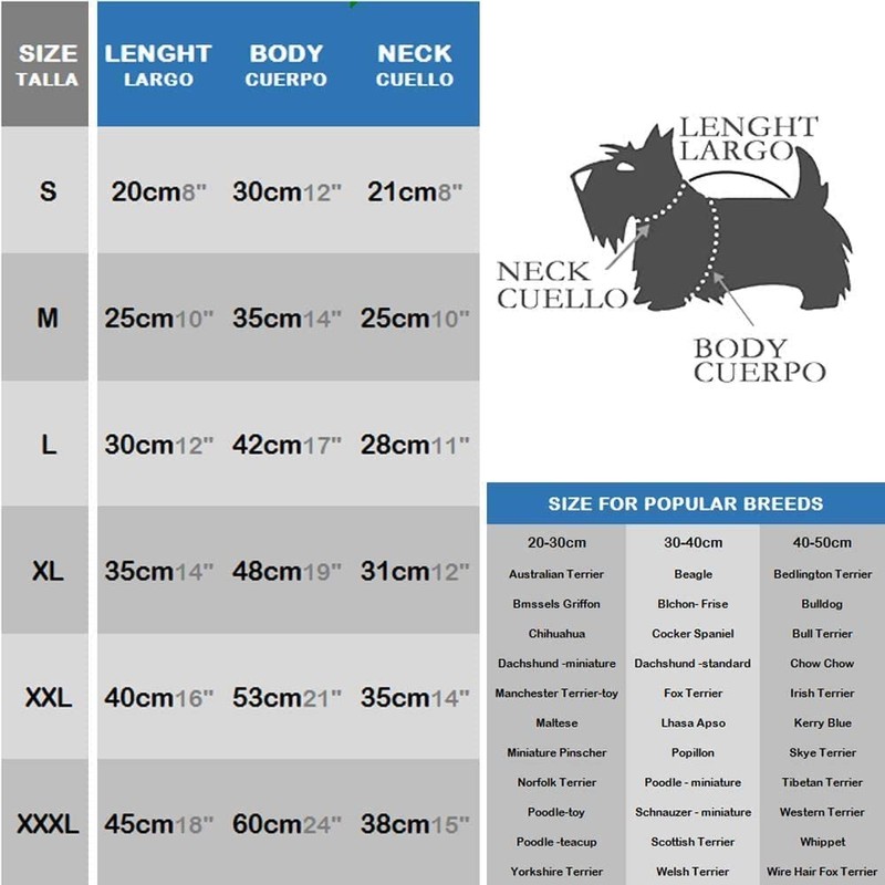 XXXL: Length: 45 cm, Body: 60 cm, Neck circumference: 38 cm.