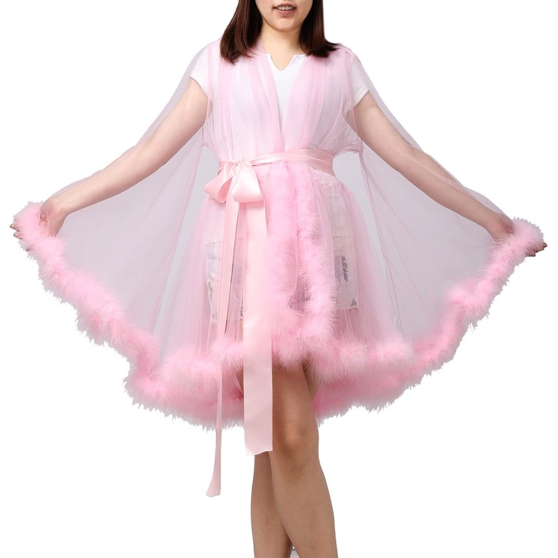 BPURB Women's Tulle Robe with Feather Photoshoot Bathrobe Illusion Wedding Gown for Party (X-Large, Pink)