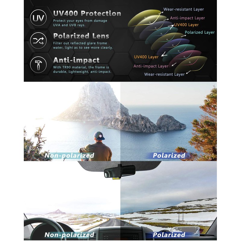 - Polarized Lens-Reduced glare and distract dazzling lights that from the road, water, light and so on for clearer vision while driving, keep you driving safer, reduce eye fatigue and improve vision clarity.