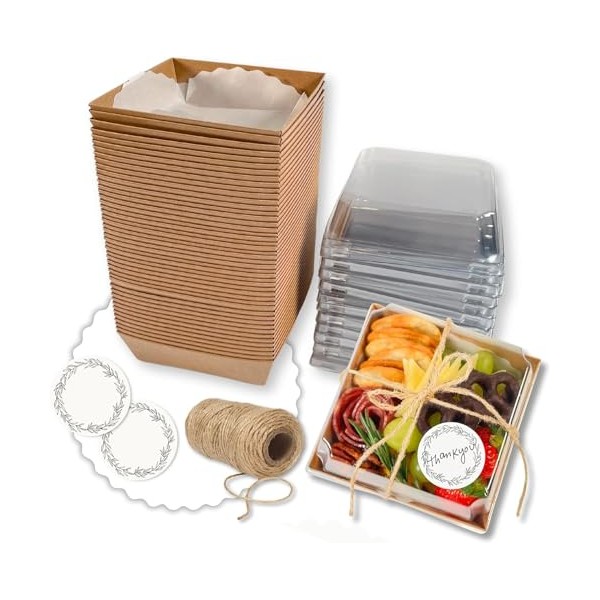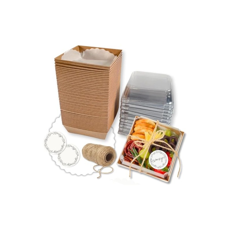 - COMPLETE VALUE GROUPING: 50ct kraft bottom boxes (5 inch x 5 inch x 2.5 inch) 50 Crystal clear lids, 50 white scalloped edge glassine wax papers liners, 65+ yards natural jute, 50 1.5 inch round stickers for personalizing. Everything you need for beautiful food presentation.