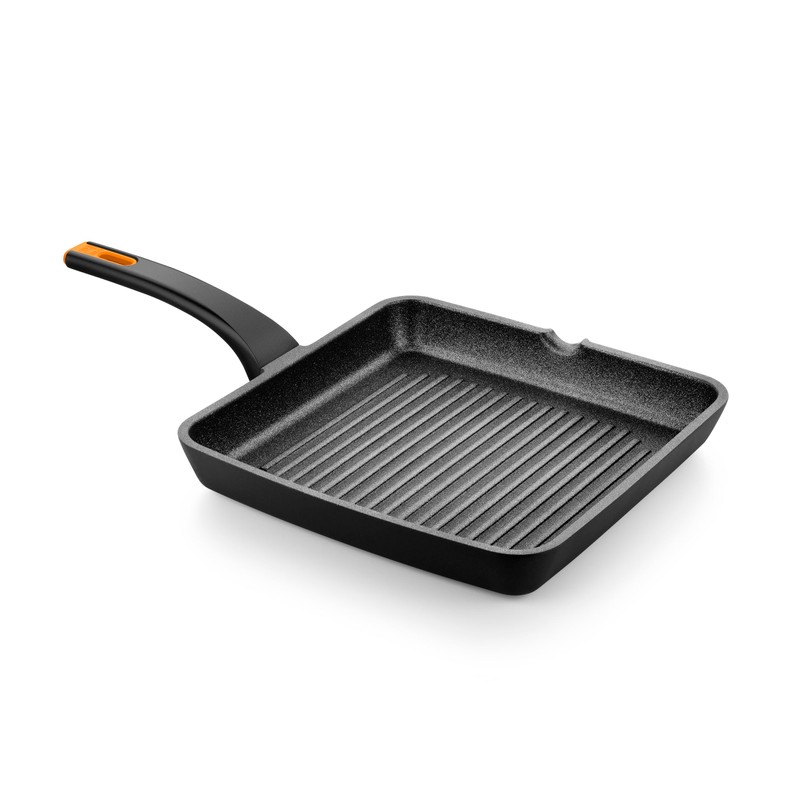 BRA Cookware Efficient Pro Cast Aluminum Ribbed Pan is a sturdy, high-quality skillet. It comes with an ergonomic, thermoresistant and secure handle. Made of thick cast aluminum with a non-stick coating, this square pan is an ultra-resistant, non-deformable, and highly durable non-stick cookware.