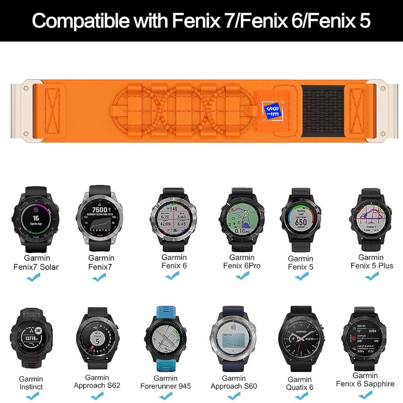 - Compatible models: 22 mm nylon strap for Fenix 7/7 Pro, Fenix 6/6 Pro Solar, Fenix 5/5 Plus, Epix Gen 2, Forerunner 965/955/955 Solar/945/945 LTE/935, Approach S70/S62/S60, Instinct/Instinct Solar. instar, instar, instar, in, Instinct Crossover, Quatix 7/6/6 Titanium/5/5 Sapphire, MARQ/MARQ Gen 2, D2 Mach 1, D2 Delta, et Descent G1/G1 Solar. (Not compatible with Fenix 5x/6x/7x/5s/6s/7s!!!)