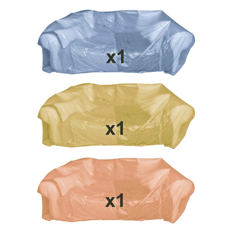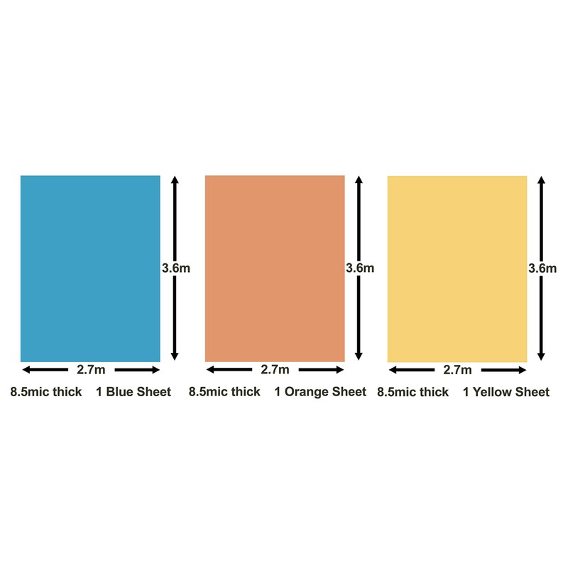 - 3 - PACK OF (1) ORANGE, (1) YELLOW & (1) BLUE COLOURED POLYTHENE PROTECTIVE DUST SHEETS - This great value 3-pack of high quality orange , yellow & blue coloured dustsheets are great for use around the home, office or garden when you need to cover and protect furniture such as sofas, tables, chairs, desks, shelves, etc. whilst decorating or renovating rooms. Measuring a large 3.6m x 2.7m each, these dustsheets give excellent coverage at a very affordable price.