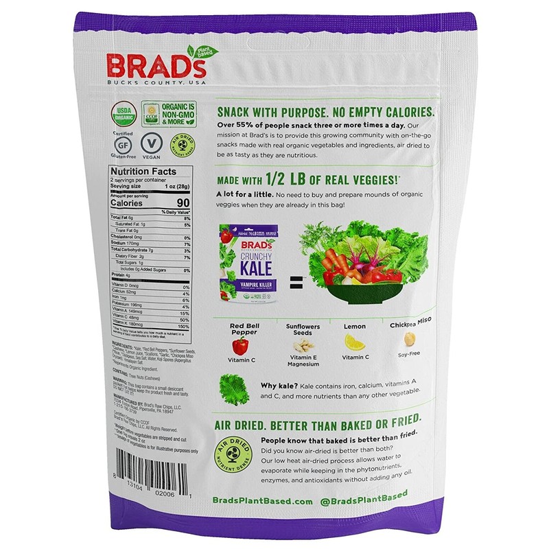 - ''' NEVER BAKED OR FRIED: Our air-crisping technique maintains all of the vitamins, nutrients & enzymes you would get from eating fresh produce. The dehydration process gives our snacks a satisfying crunch!#||# THE BEST INGREDIENTS: We thoughtfully select organic & non-GMO vegetables, seeds & spices to make nutrient-dense combinations. Our chips are packed with naturally occurring vitamins, minerals & fiber.#||# HEALING FOODS: Raw means that we do not heat any of our ingredients over 115 degrees Fahrenheit. Because our foods are processed at a low temperature, they provide valuable enzymes & essential nutrients.#||# SNACK WITH PURPOSE: At Brad's, we believe that what you eat impacts how you feel. Try the full range of healthy, vegan & gluten-free raw snacks including Crunchy Fruit Kale, Crunchy Kale & Veggie Chips.'''