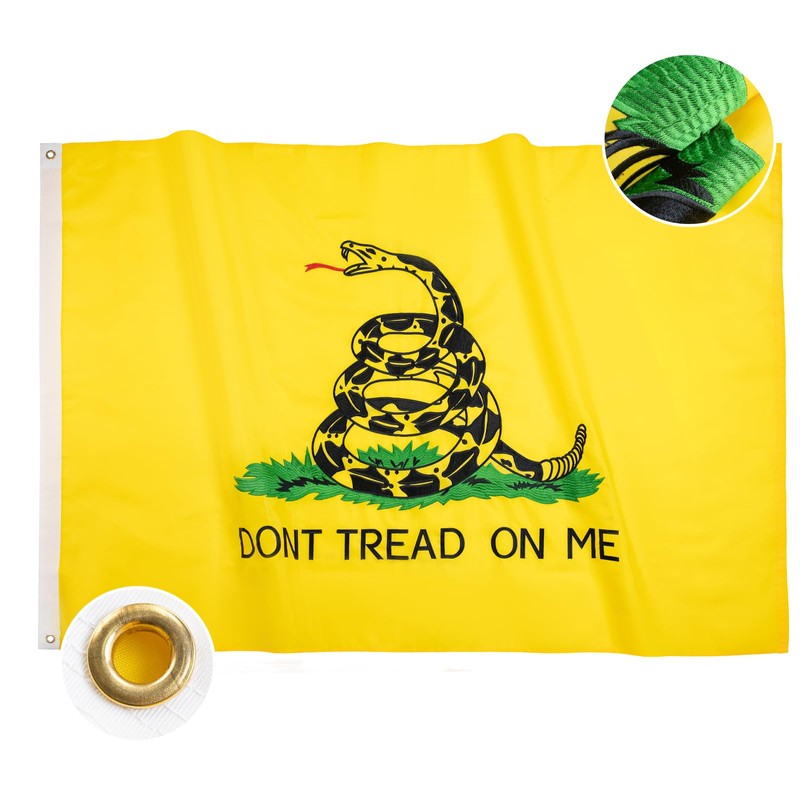 - 🐍5x8 ft Gadsden Flags - Double Sided and Embroidered Gadsden Flag, The material of this flag is nylon, it is heavy duty, will last long and won't be shredded.