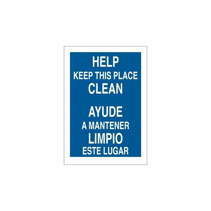 Housekeeping Sign, Sign Subject Matter Cleaning and Maintenance, Height 14 In., Width 10 In., Sign Material Polyester, Sign Mounting Style Adhesive Surface, Header No Header, Legend Help Keep This Place Clean/Ayude A Mantener Limpo Este Lugar, Printed Language English, Spanish, Sign Shape Rectangle