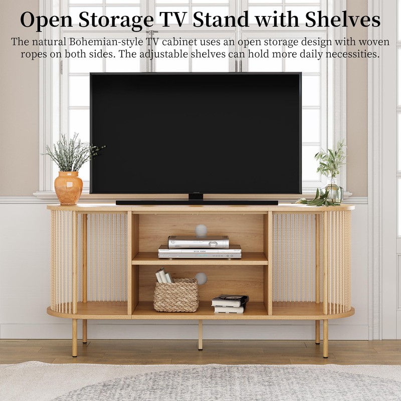 Brafab Oval Boho TV Console with Hand-Woven Ropes, Mid-Century Modern TV Stand for up to 60" with Storage Adjustable Shelf and Sturdy Steel Legs, Natural Wooden Entertainment Center for Living Room
