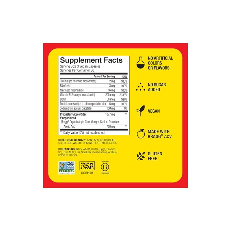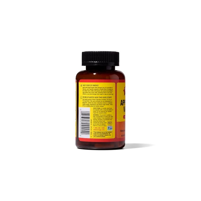 • BRAGG ACV CAPSULES: Energy supplement made with 1877mg of our proprietary ACV blend and 750mg of acetic acid per serving, plus B vitamins for energy