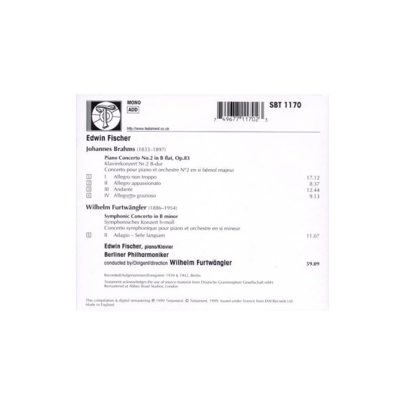Brahms : Concerto pour piano & orchestre n° 2, Op. 83 - Furtwängler : Concerto symphonique (Adagio) / Edwin Fischer, piano - Orchestre Philharmonique de Berlin, dir. Wilhelm Furtwängler