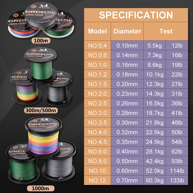 - Multiple choices: OROOTL offers braided PE fish lines in dark green, grey and multi-colours. Each colour has a different size. Whether you want sea fishing, sea fishing, ice fishing, etc., our braided fishing line can accompany you on a wonderful fishing trip.