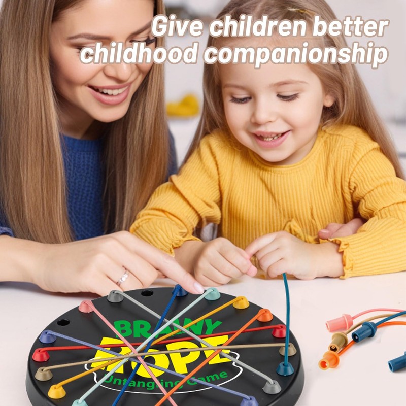 - Game Description: Twist the ends of up to 10 ropes into knots or cross them and insert them into the 22 holes on the game board. Players need to move a section of the rope from above the other ropes to an empty hole, and cannot pass through from below. To win the game, untie all the ropes