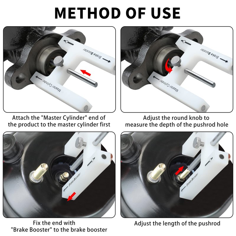 • METHOD OF USE: First, fix the end of "Master Cylinder" on the product, adjust the round knob to measure the depth of pin hole, and then fix the end of "Brake Booster" on the propeller to adjust the length of the push rod