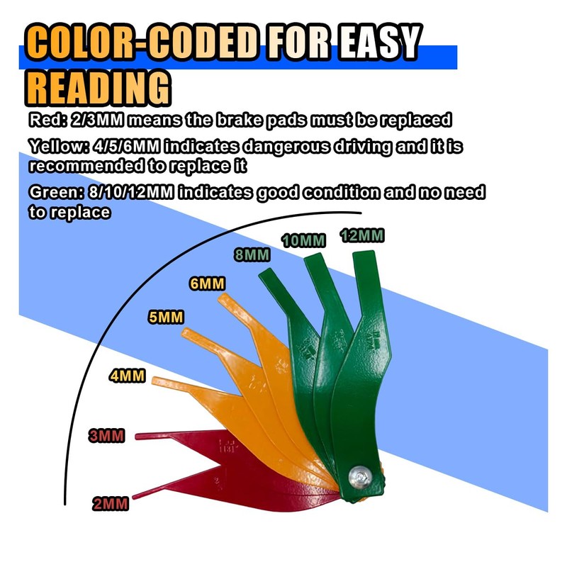 - 【Metric and SAE】: Offering both Metric and SAE units with vibrant color indicators, this brake pad measure ruler tool makes brake pad thickness assessment a breeze. Monitor a thickness range from 2mm to 12mm or 0.0787 inches to 0.4720 inches with ease.