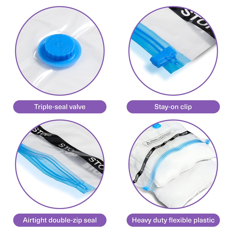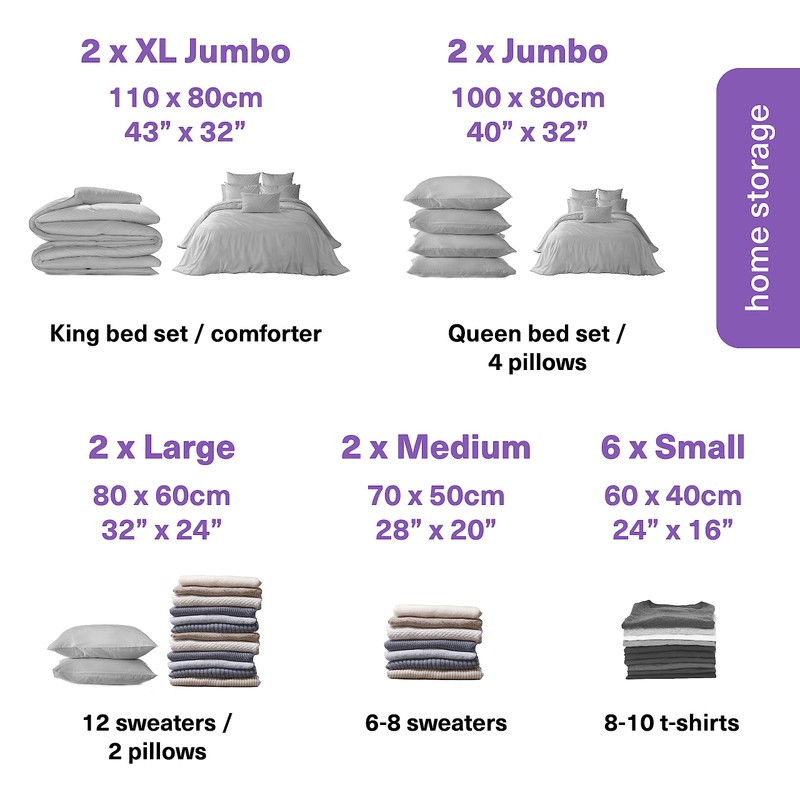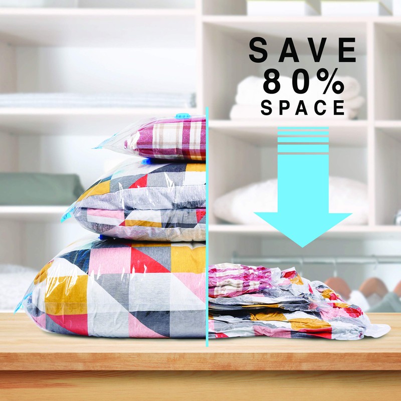 - 80% space saving: our compact vacuum storage bags provide 4 times as much storage space in your drawers, wardrobe and suitcases. Saves space and expense on travel and daily life. Perfect for storing clothes, pillows, duvets, duvets, duvets and much more.