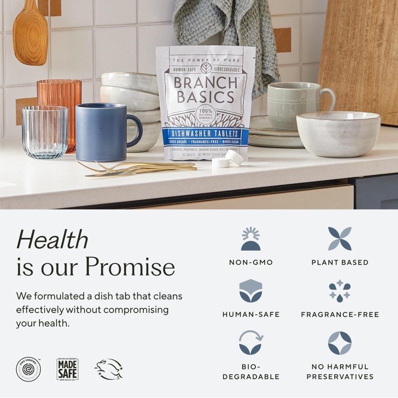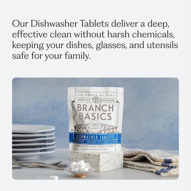 Branch Basics Dishwasher Tablets – 40 Ct, 3 Pack | Plastic-Free, Fragrance-Free, Human-Safe | Delivers a Powerful Clean Without Harsh Chemicals