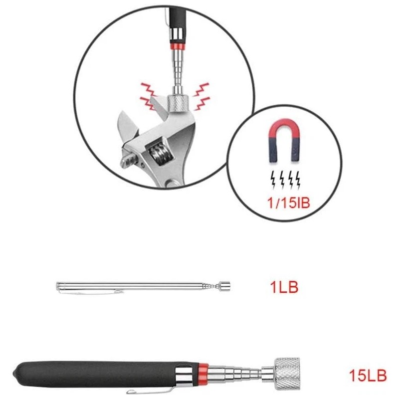 - 【Magnetic Pickup Tool Wand】 Featured a strong magnetic head, the stick has a lift capacity up to 15 lbs. And the design of a non-slip rubber grip and a flexible length from 7.2 inch to 30.7 inch make it more convenient to pick up proper weight metal objects like bolts, nuts, screws or some hardware tool like hammer, screwdriver and more. It also comes with pen buckle, convenient for carry in pocket.