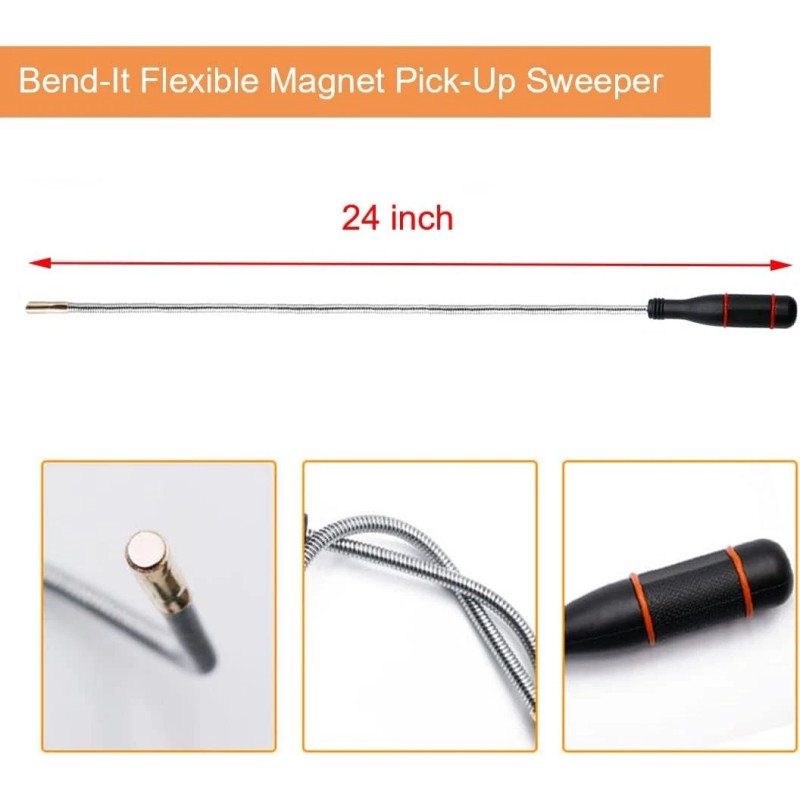 - 【24 inch Bend-It Flexible Magnet Pick-Up Sweeper】Magnetic pick-up tool flexible & bendable wound-steel spring loaded cable with easy comfortable grip handle on top, with spring on the bottom, makes this grabber tool accessible to all hard to reach narrow bended places and makes easy retrieval of small and non-ferrous objects that magnets cannot.