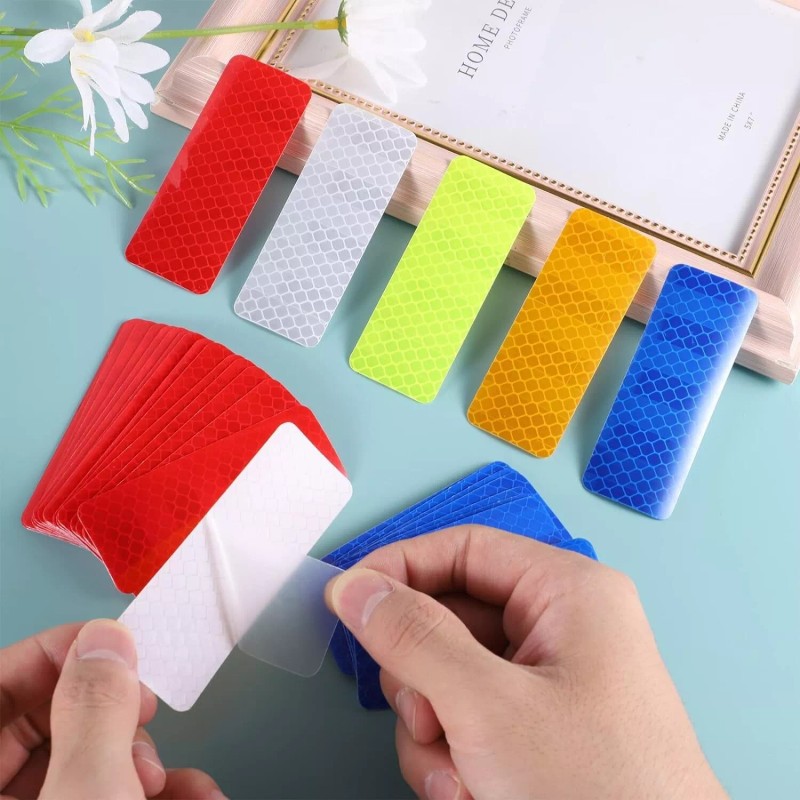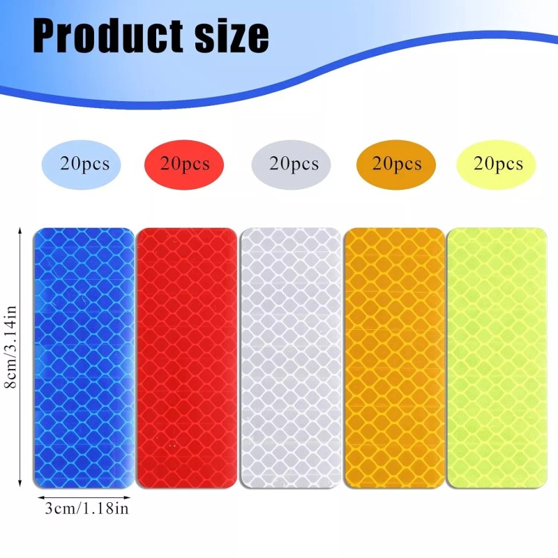 - Sufficient Quantity: The package contains reflective stickers in five colors: orange, green, red, silver, and blue, 20 pcs reflective tapes for each color, with a size of 1.18×3.15 Inch, a total of 100 pcs reflective tapes