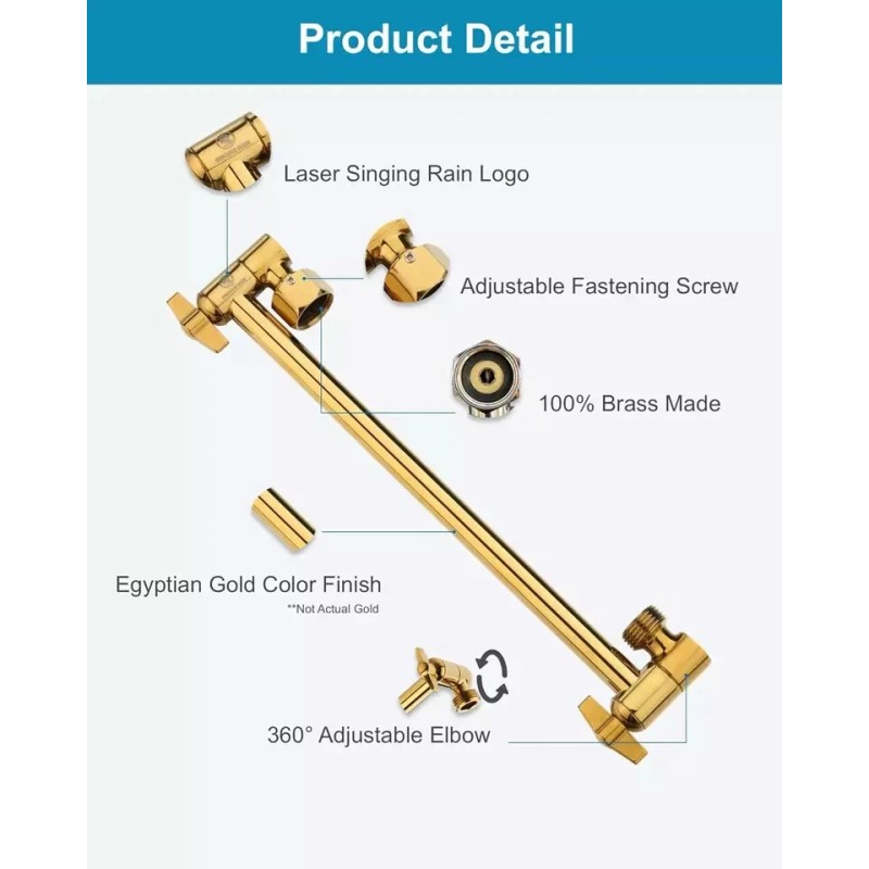 11 Inch Egyptian Gold Adjustable Shower Head Extension Arm with Locking Set Screw, Singing Rain Solid Brass Angle Height Adjustable, Easy to Install, G1/2 Universal Connector